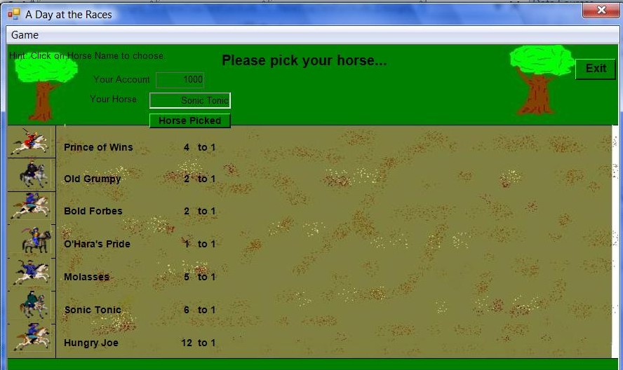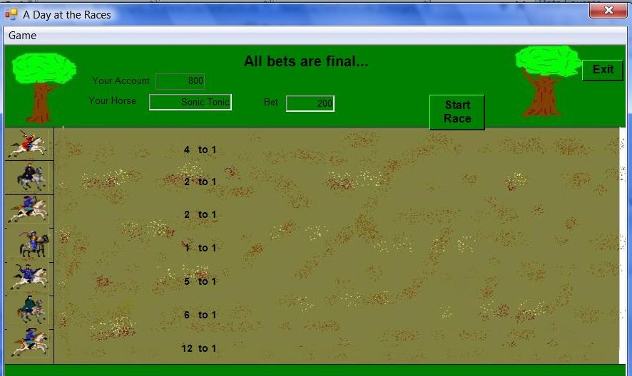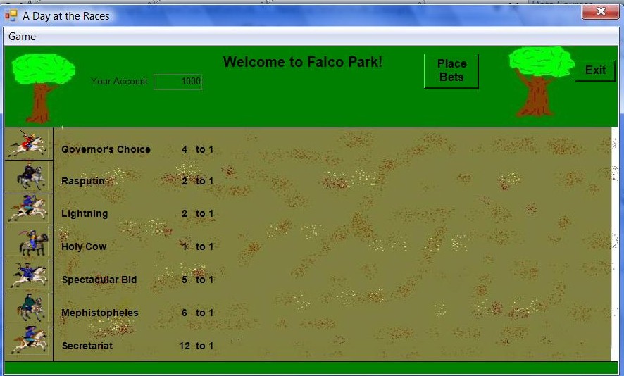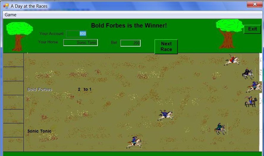 This Visual Basic program is a horse racing game called "A Day At The Races". I originally programmed this in Visual Basic 6.0, and have since updated it, first to the original VB.Net, and more recently to VB 2008.