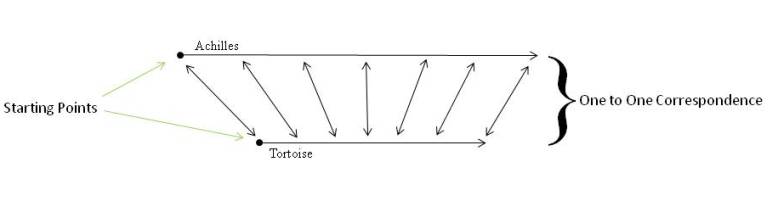 To explain away Zeno’s motion paradox, Cantor said that Achilles’ path is much longer than the tortoise’s path. Achilles may go further than the tortoise without actually touching more points.
